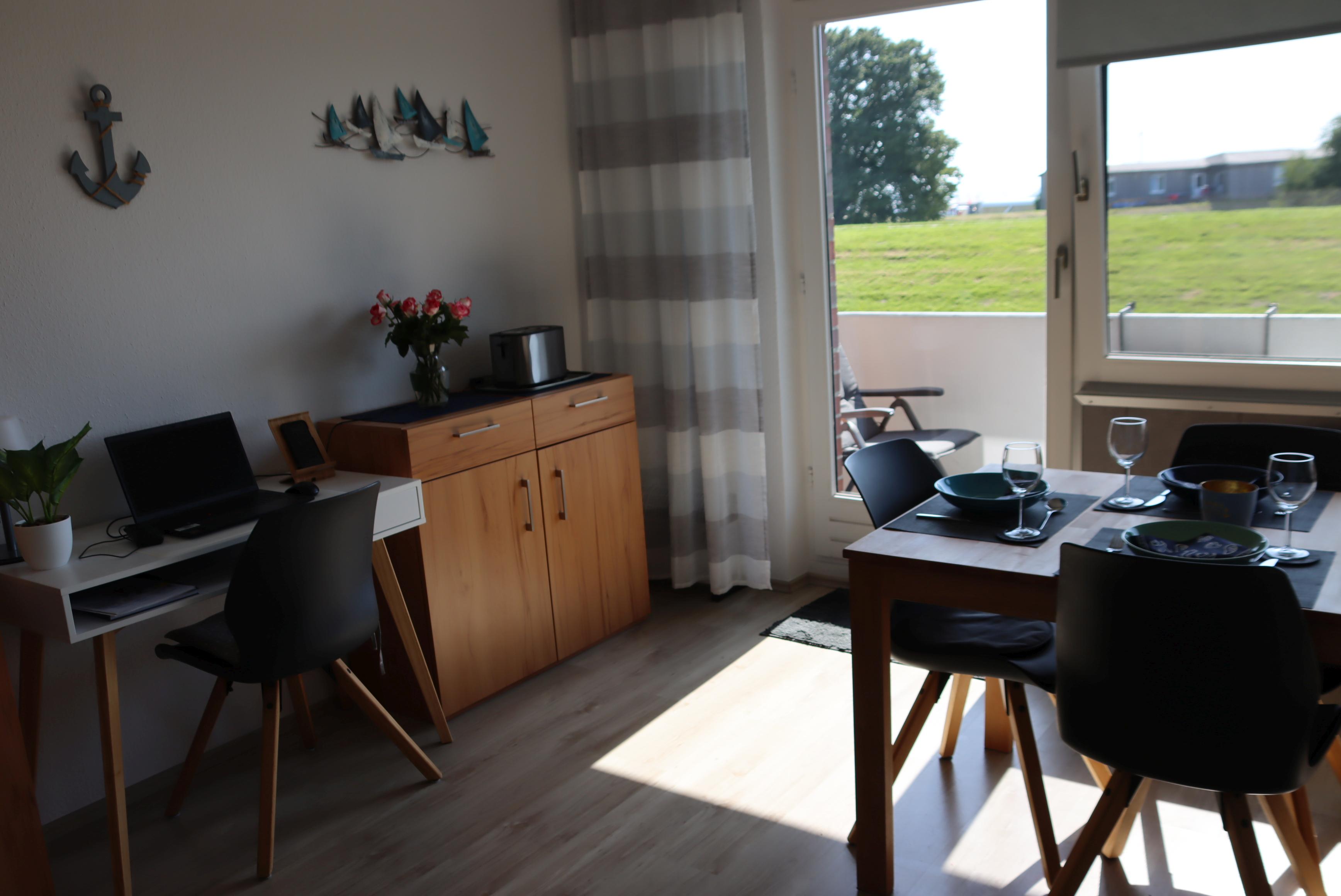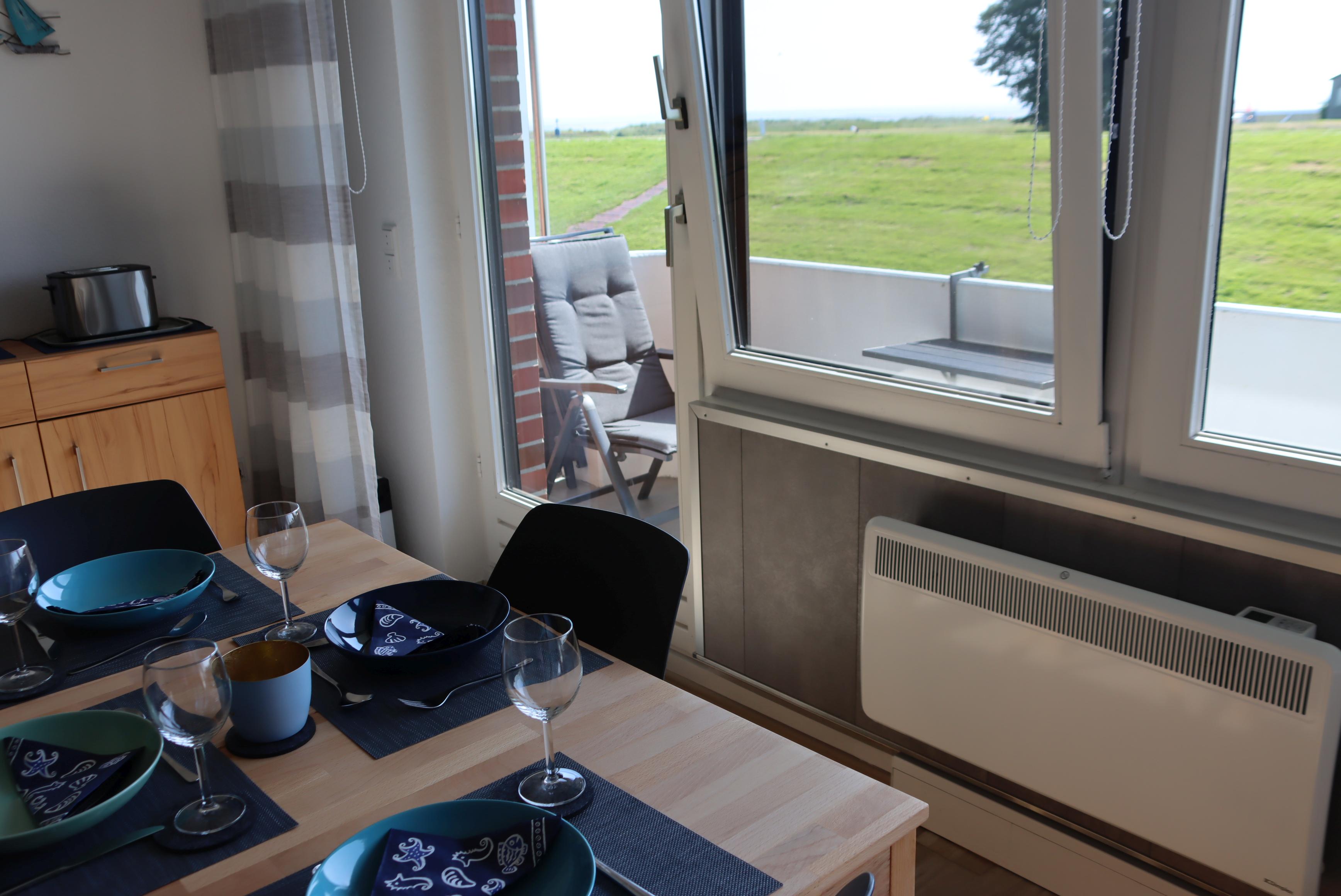 Die Wohnung befindet sich direkt am Deich und bietet vom Wohn-/Esszimmer und vom Balkon einen wunderbaren Meerblick!
